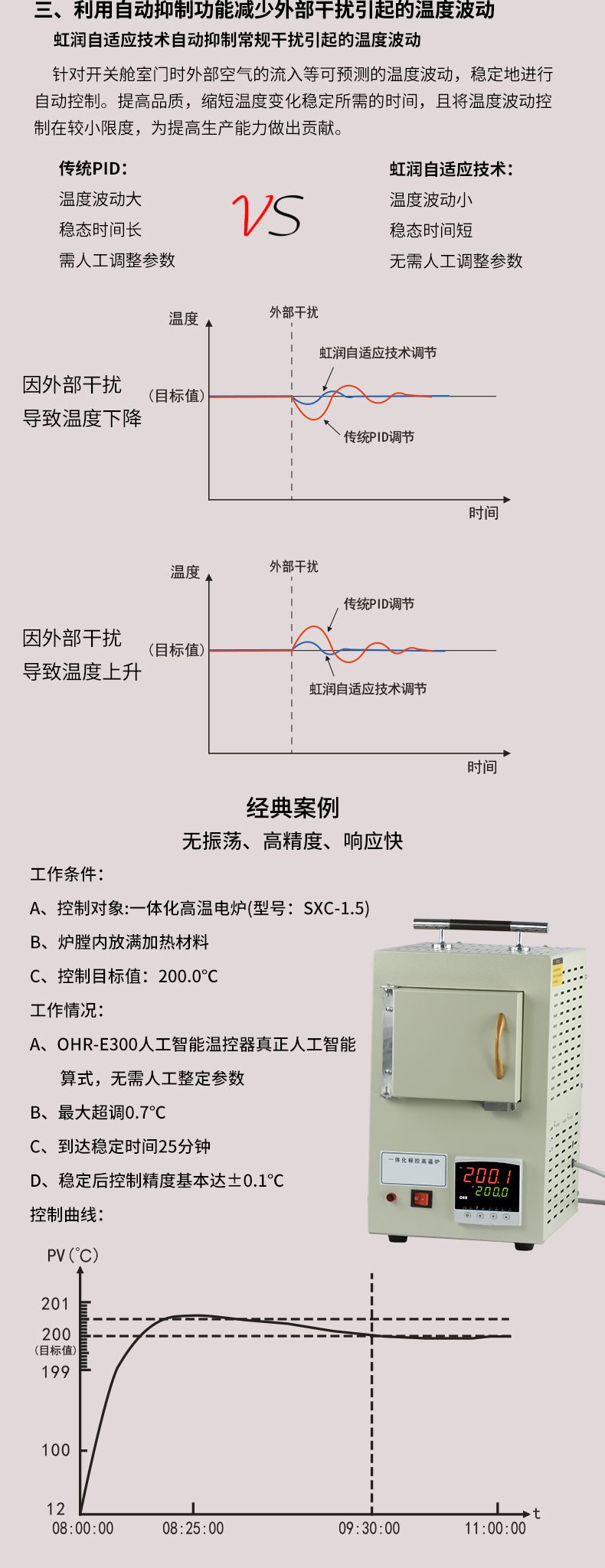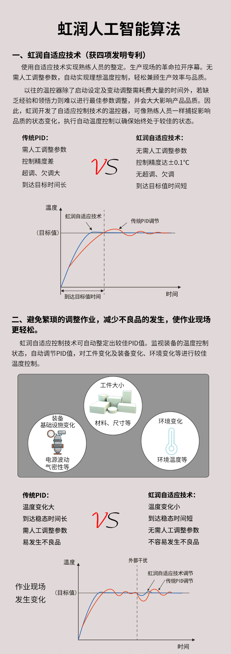虹潤(rùn)公司是專業(yè)生產(chǎn)溫控器的國(guó)家專精特新“小巨人”企業(yè)。生產(chǎn)的人工智能溫控器,具有真正人工智能算式,無需人工整定參數(shù),控制精度可達(dá)±0.1°C,多種輸出類型,高抗干擾等特點(diǎn)。產(chǎn)品獲得模糊PID控制儀及控制方法、人工智能調(diào)節(jié)器、智能化控制器、移相觸發(fā)控制器、閥門自動(dòng)手動(dòng)無擾動(dòng)操作控制方法及裝置等5項(xiàng)國(guó)家發(fā)明專利,主持起草工業(yè)過程控制系統(tǒng)用模擬輸入兩位或多位輸出儀表、物聯(lián)網(wǎng)智能溫度儀表通用技術(shù)條件、工業(yè)過程測(cè)量和控制系統(tǒng)用智能調(diào)節(jié)器等3項(xiàng)國(guó)家標(biāo)準(zhǔn),以及通信系統(tǒng)多通道數(shù)據(jù)采集控制終端規(guī)范軍用標(biāo)準(zhǔn),參與國(guó)際5G標(biāo)準(zhǔn)制定,取得模糊PID溫控儀等3項(xiàng)相關(guān)軟件著作權(quán)。產(chǎn)品廣泛應(yīng)用于電力、石化,冶金、制藥、食品等幾乎所有工業(yè)現(xiàn)場(chǎng),實(shí)現(xiàn)精準(zhǔn)控溫,保障生產(chǎn)安全與質(zhì)量。