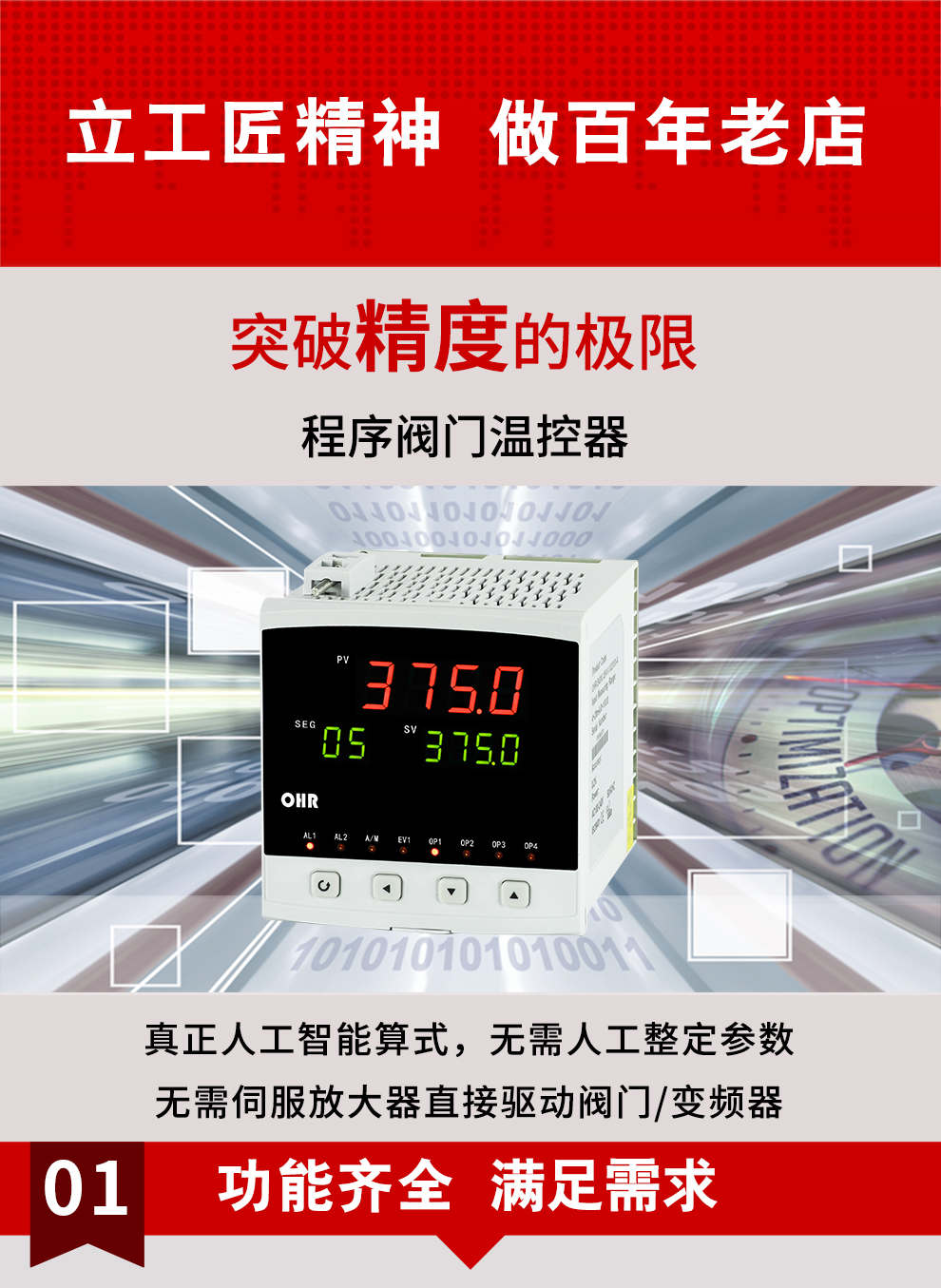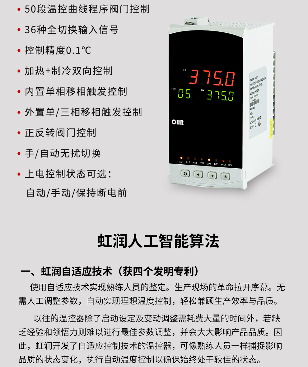 OHR-E401系列程序閥門溫控器/調(diào)節(jié)儀采用真正的人工智能算式,儀表啟動(dòng)自整定功能,可以根據(jù)被控對(duì)象的特性,自動(dòng)尋找最優(yōu)參數(shù)以達(dá)到很好的控制效果,無(wú)需人工整定參數(shù)。控溫精度基本達(dá)±0.1℃,無(wú)超調(diào)、欠調(diào),達(dá)國(guó)際先進(jìn)水平。