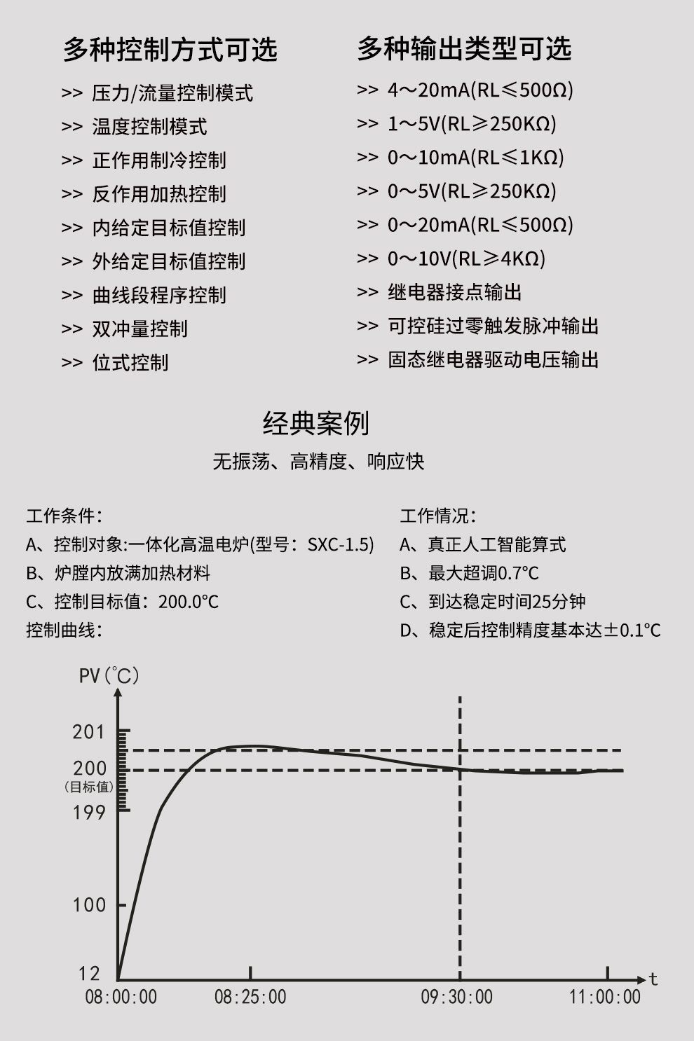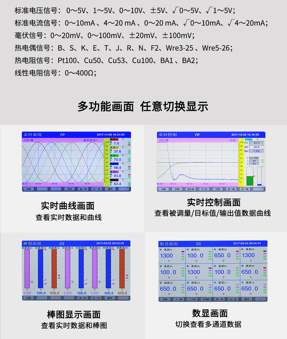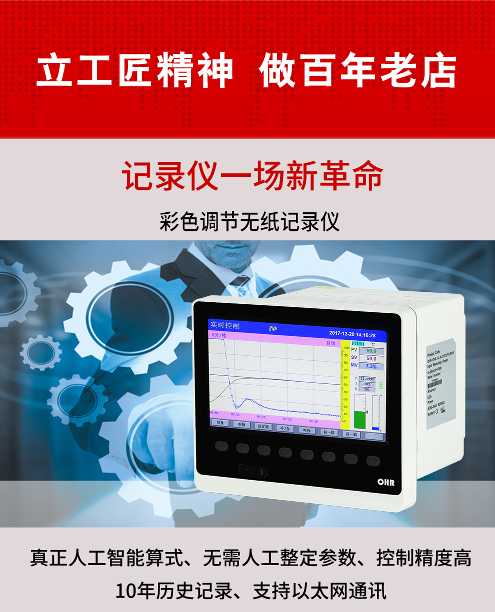 OHR-H300系列彩色調(diào)節(jié)無紙記錄儀采用真正的人工智能算式,儀表啟動(dòng)自整定功能,可根據(jù)被控對象的特性,自動(dòng)尋找最優(yōu)參數(shù)以達(dá)到很好的控制效果,無需人工整定參數(shù)??販鼐然具_(dá)±0.1℃,無超調(diào)、欠調(diào),達(dá)國際先進(jìn)水平。24路萬能輸入(可組態(tài)選擇輸入:標(biāo)準(zhǔn)電壓、標(biāo)準(zhǔn)電流、熱電偶、熱電阻、毫伏等)其中可帶8路控制輸入。